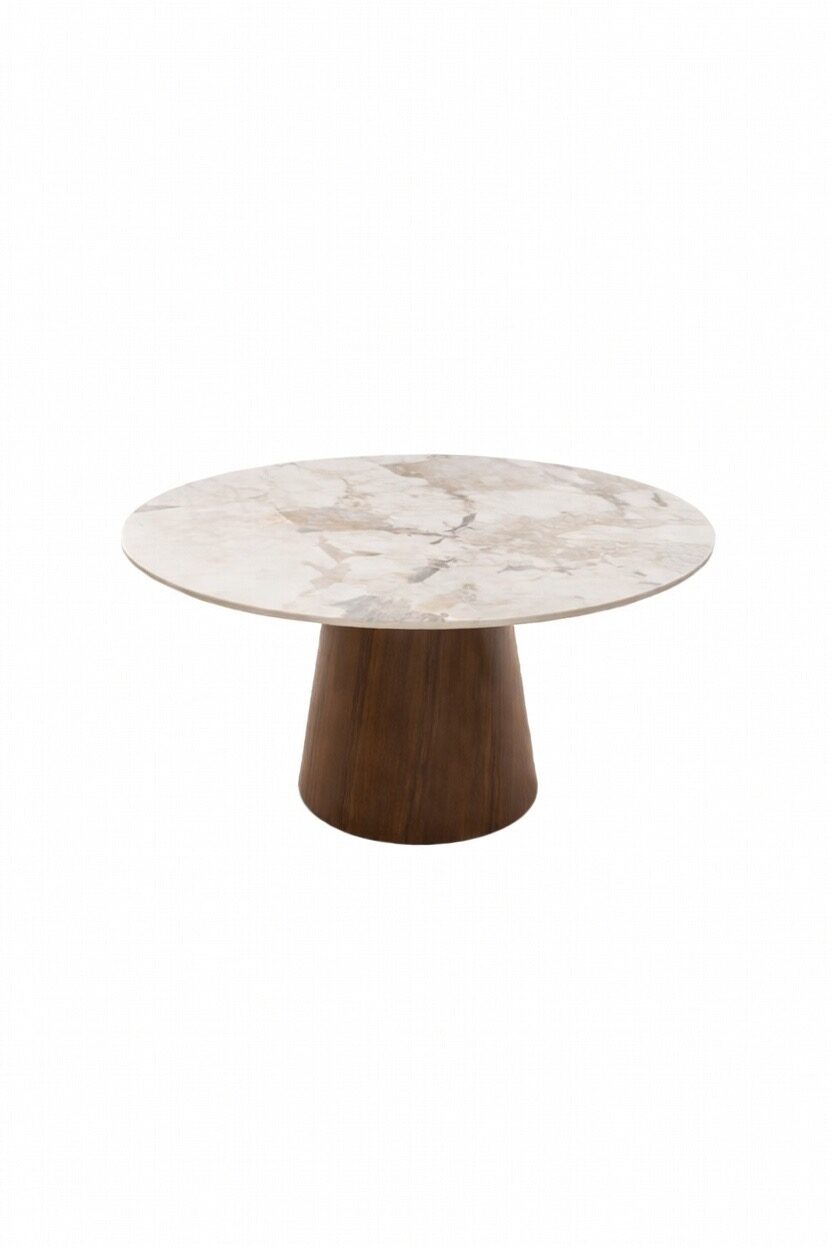 Base conica in rovere o noce, disponibile in diverse finiture. Il piano realizzabile su misura nelle varianti legno, fenix, hpl o ceramica.