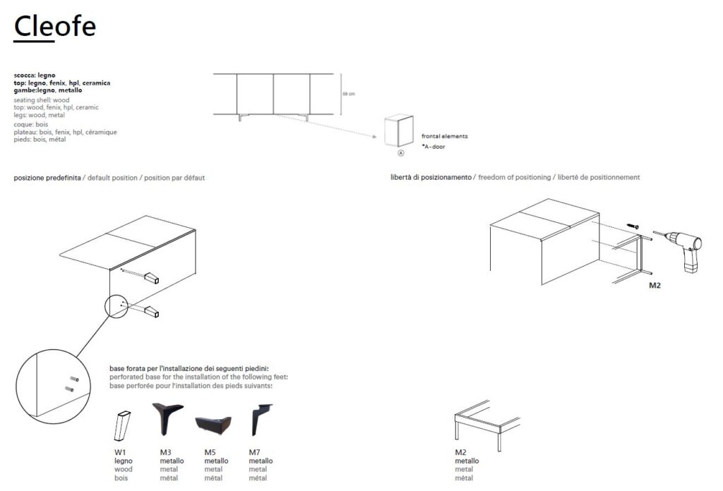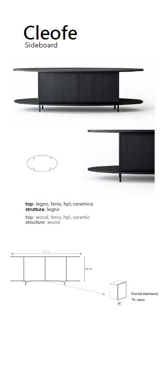 Cleofe è sistema a giorno, consolle e libreria. La struttura può essere in rovere nelle diverse colorazioni o in noce ossido; i piedini in metallo nero. Il segreto è nella sua struttura, forte, elementare, versatile. Cleofe è una madia che trova nuove declinazioni, nuove possibilità, secondo il contesto, il luogo, le esigenze. Reinterpretando ogni volta i propri elementi, in ragione di scopo e spazio, ma senza mai perdere unitarietà, coerenza, impeccabile effetto estetico.