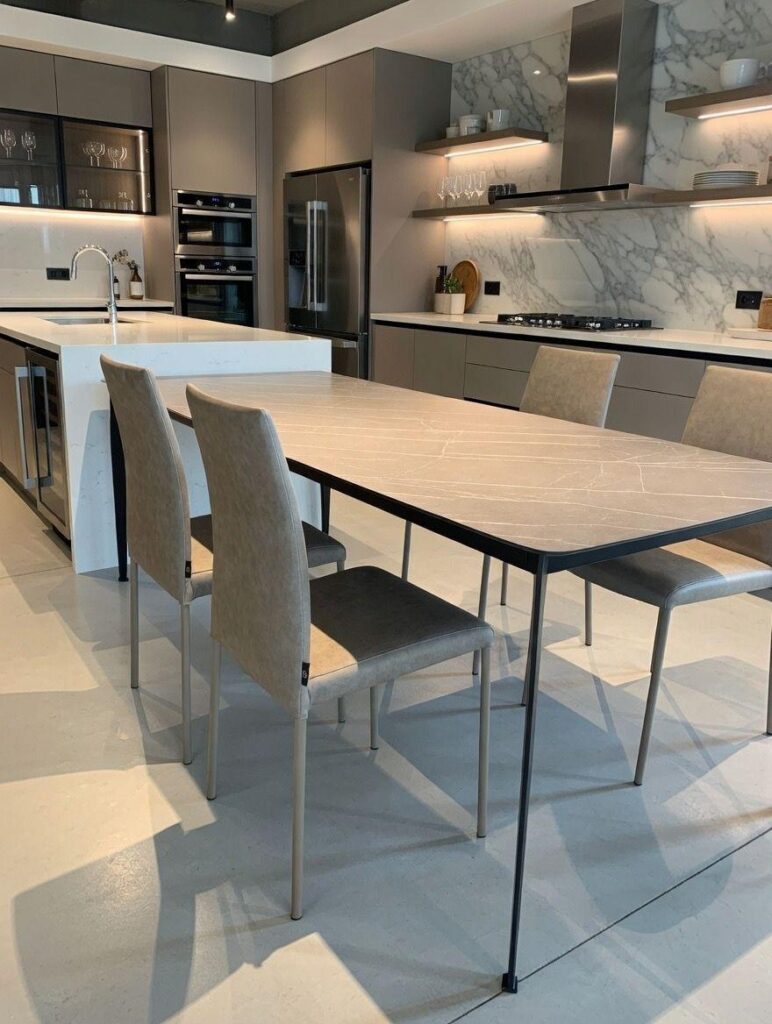 Mesa Mad con base de cuatro patas. Patas y estructura en metal pintado blanco o negro. Fijo o extensible disponible con encimera de madera, fenix, hpl, cerámico. Apto para uso en exteriores.