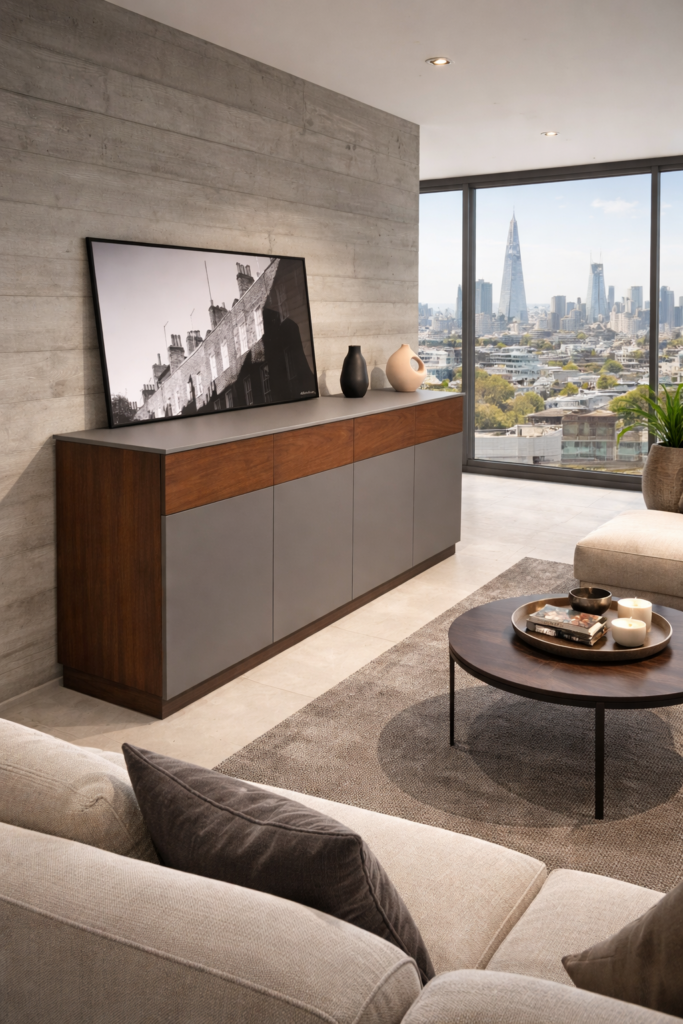 Aparadores modulares con encimera en madera (roble o nogal), fenix, hpl o cerámico y pies de su elección (de 5 a 17 cm) en madera o metal. Puertas con apertura push-pull y cajones con sistema de amortiguación amortiguado. Posibilidad de puertas y cajones en fenix o hpl.