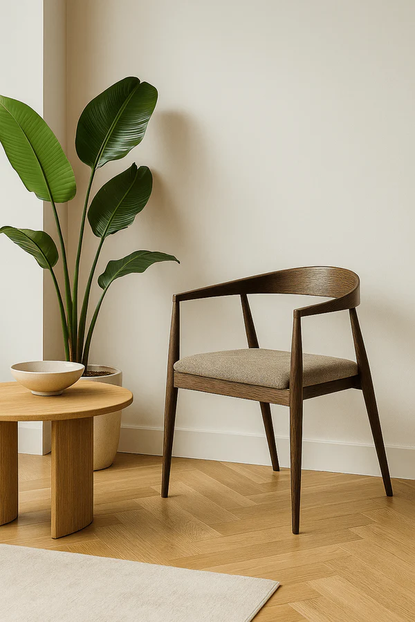 Una silla de aspecto clásico, con un toque extra gracias a la curvatura de la parte posterior. Disponible en roble en varios acabados y asiento acolchado.