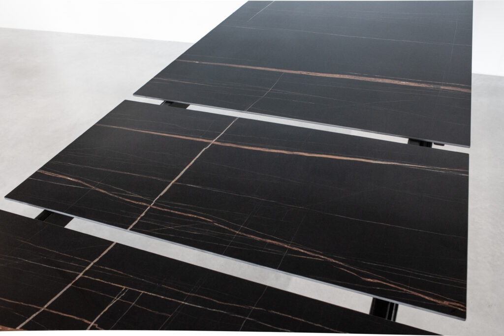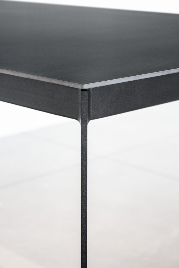Tavolo Mad con base a quattro gambe. Gambe e struttura in metallo verniciato nero o bianco. Fisso o allungabile disponibile con piano in legno, fenix, hpl, ceramica. Adatto ad un utilizzo outdoor.
